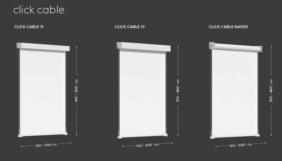 Kolekcija vertikalnih rolojev s pravokotno kaseto in izvlečnim profilom, ki se spušča po inox pletenicah.