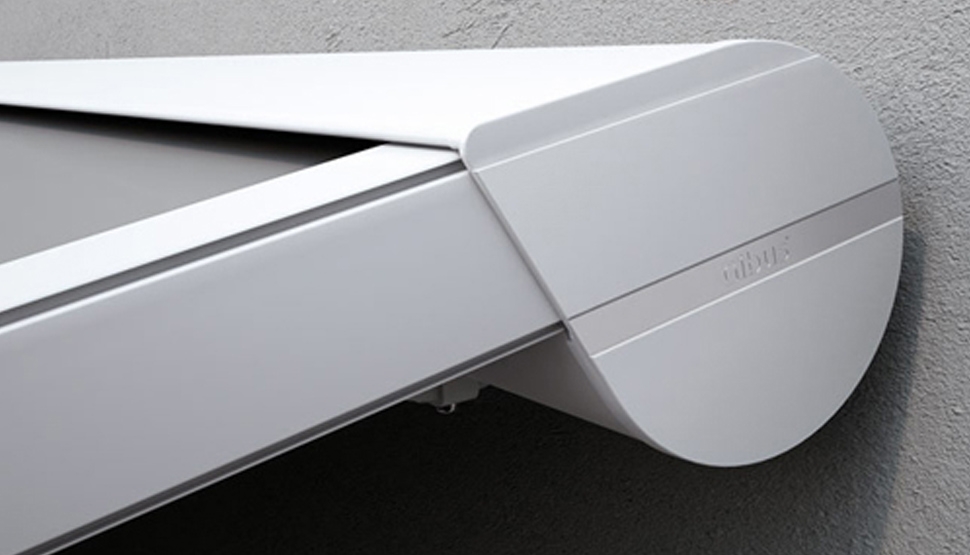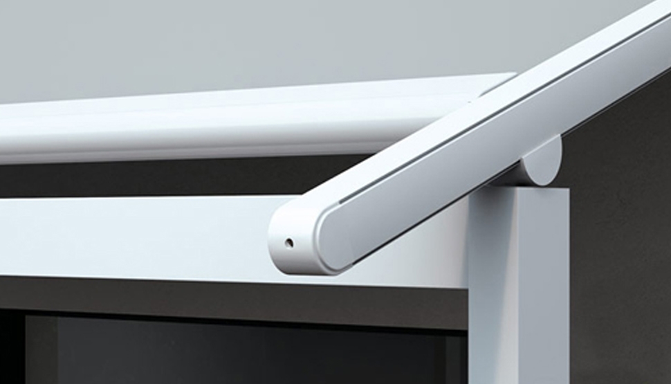 ZERO+ je lahkotna pergola z integriranim rolo ostrešjem, ki se navija v zaščitno kaseto, pritrjeno na steno ali strop.