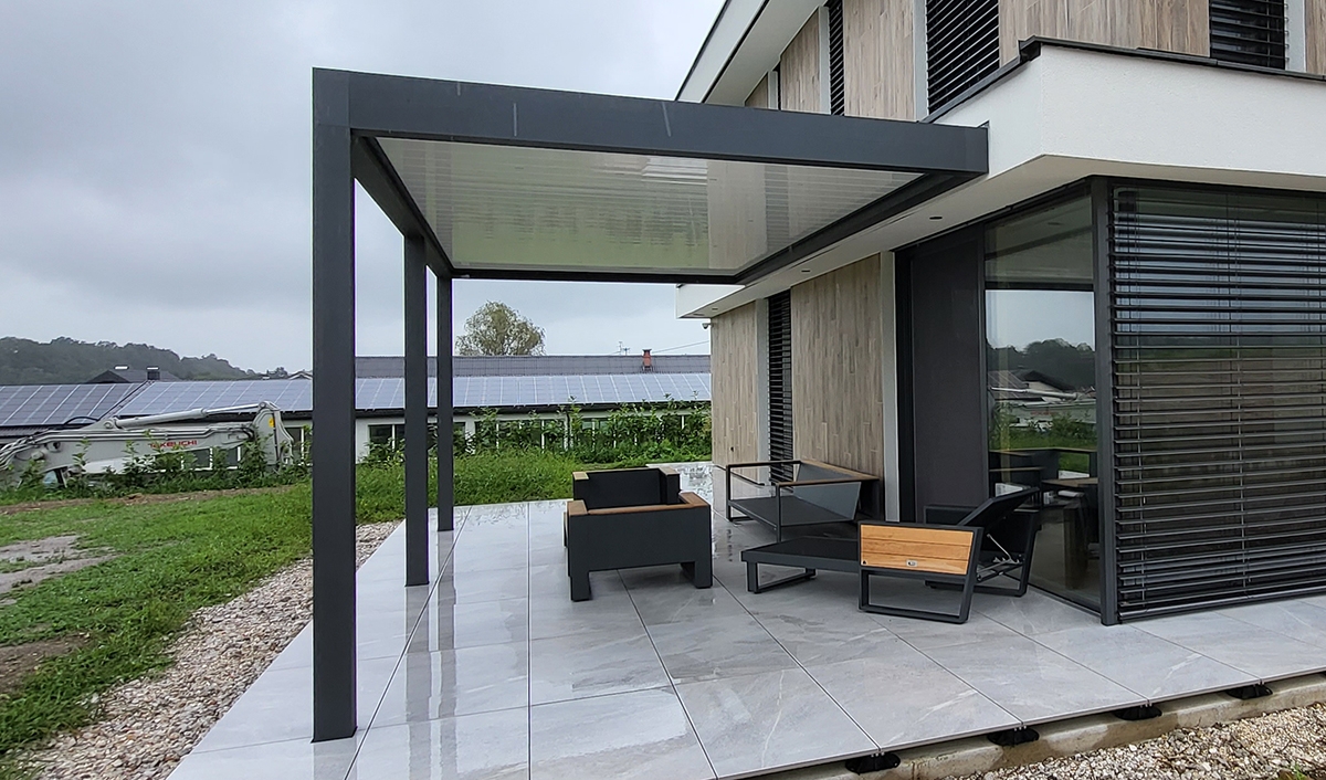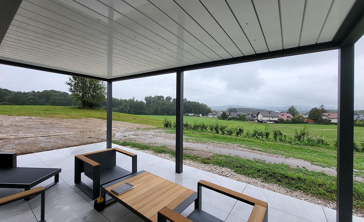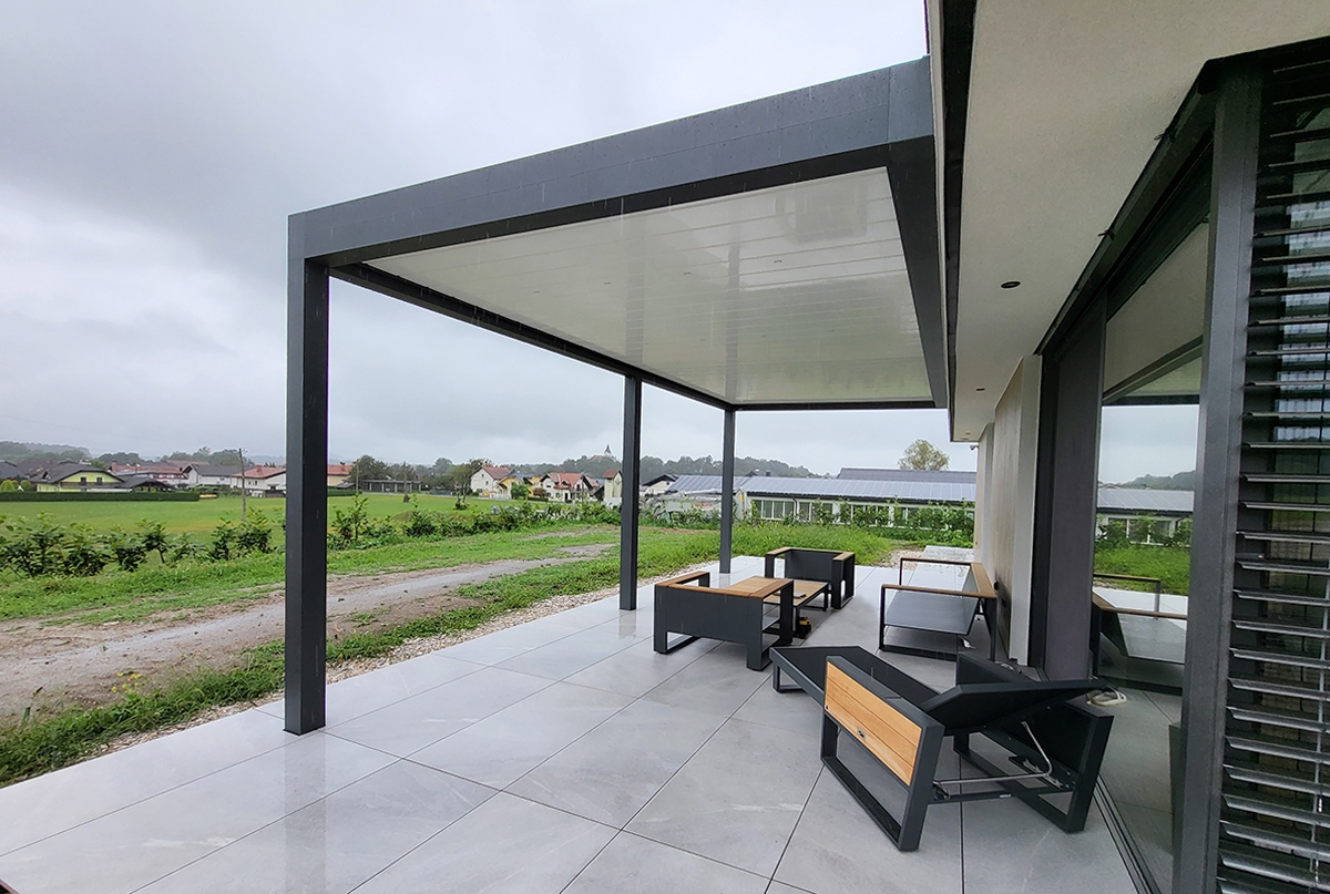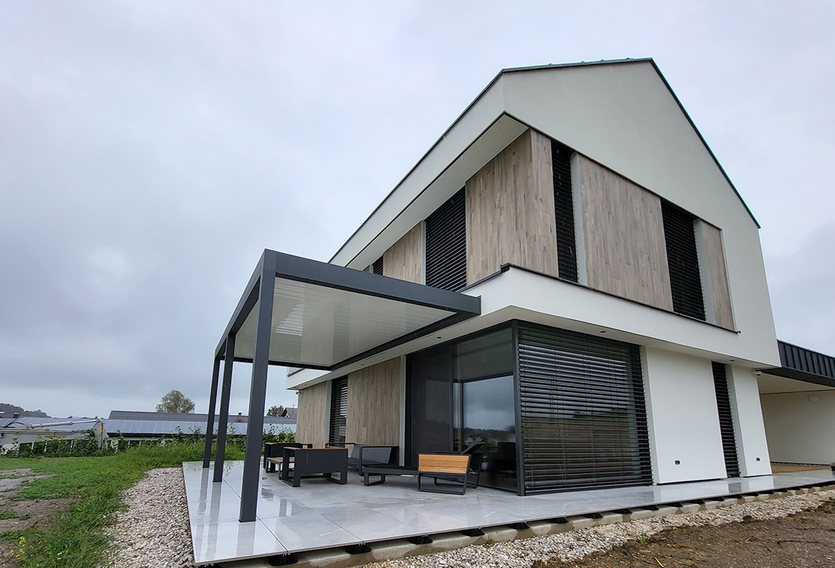 na terasi moderne družinske hiše v okolici Ljubljane.