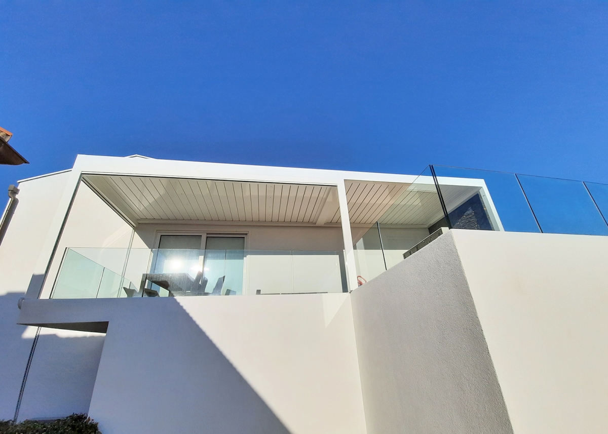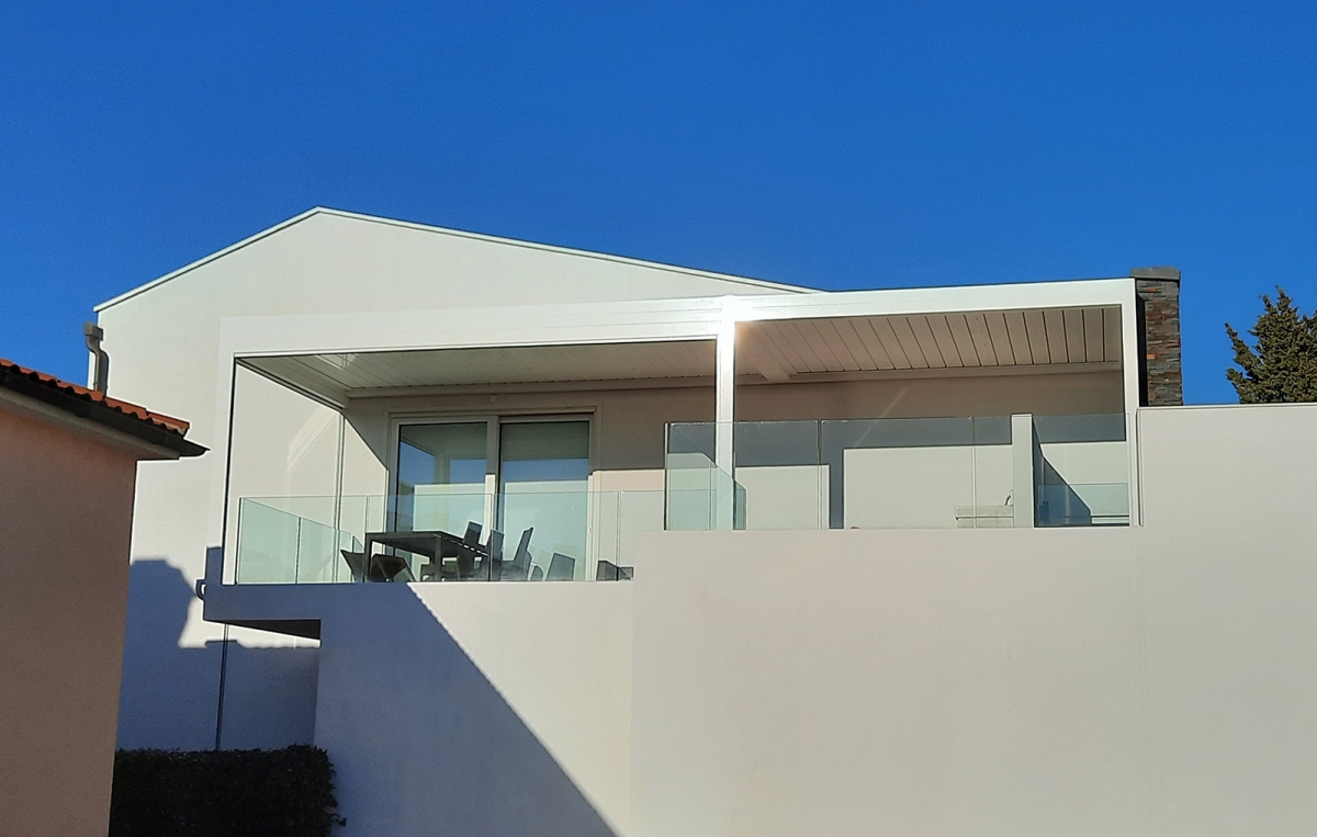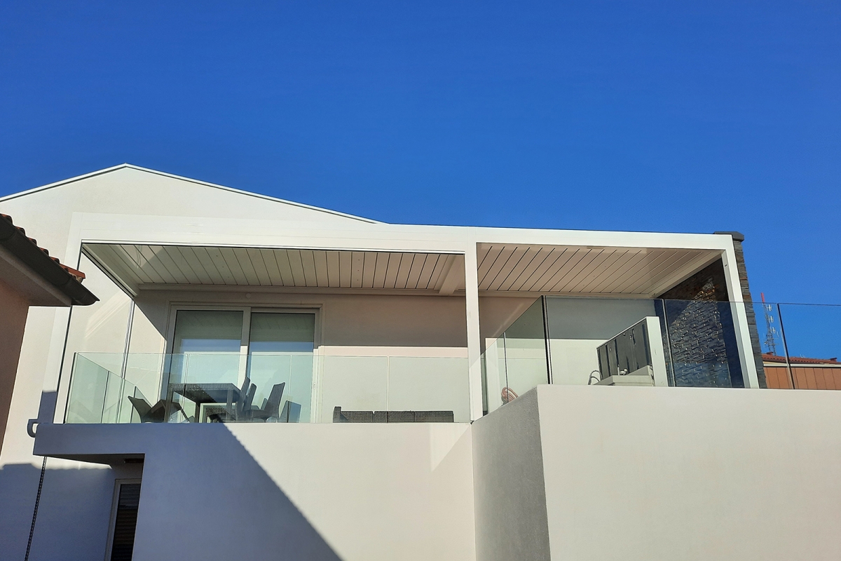 Bioklimatska pergola JOY + kasetni ZIP-Screen roloji CLICK-ZIP + LED SPOT svetila integrirana v lamelah.