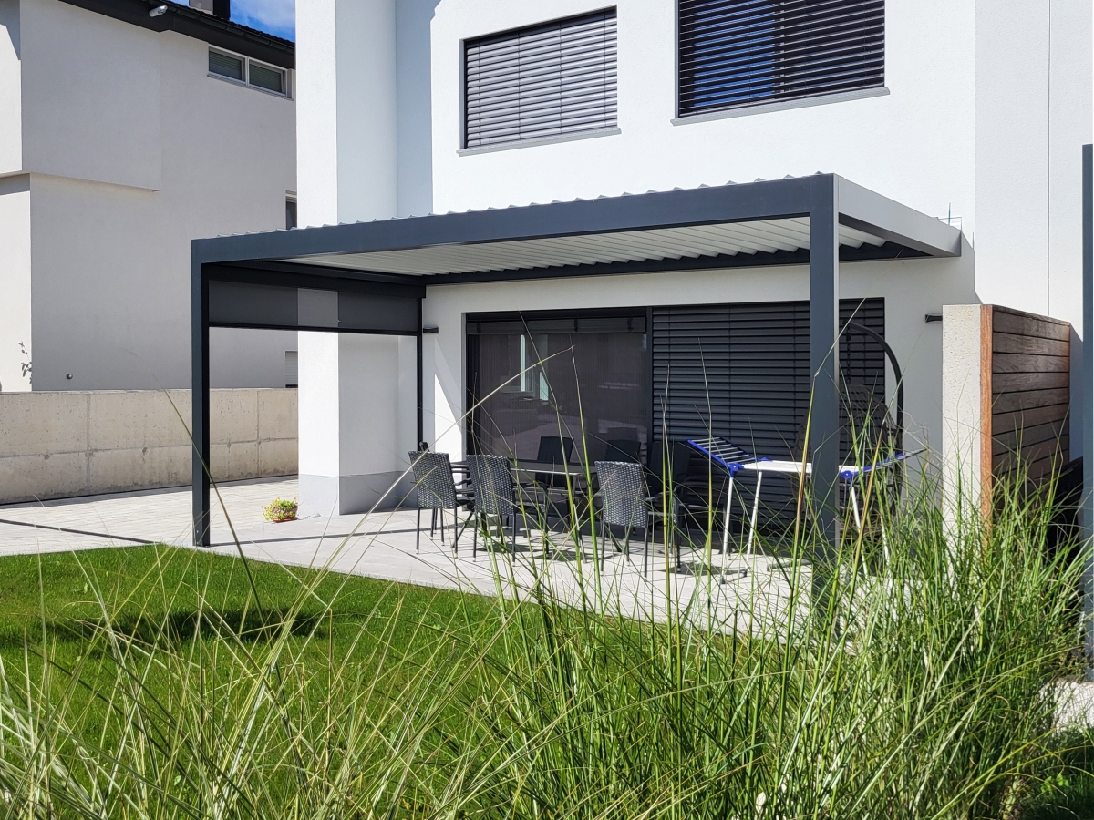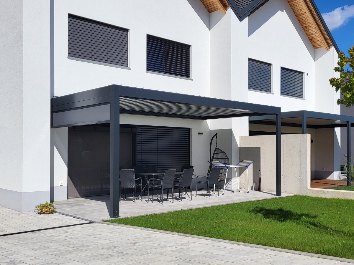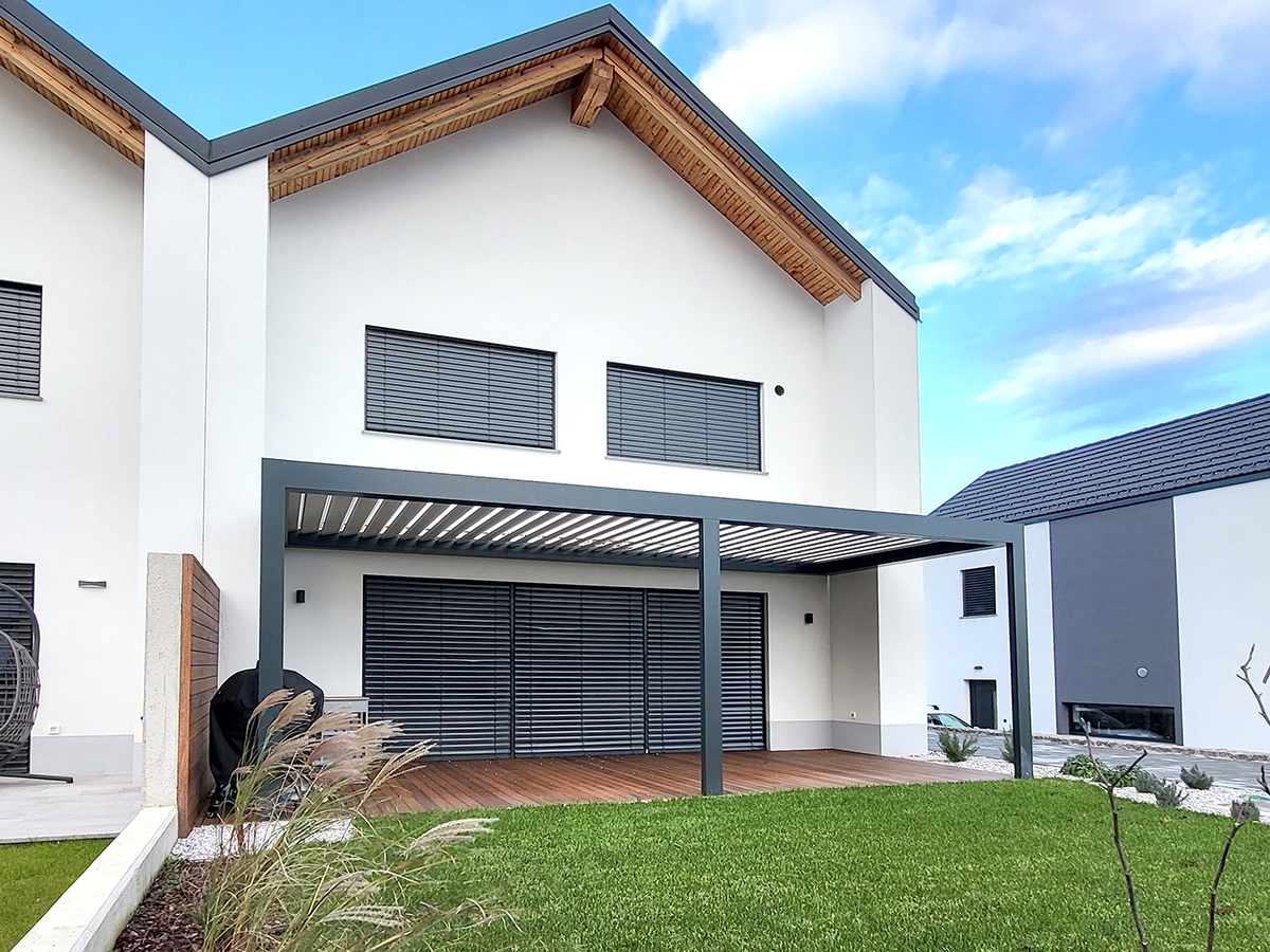 Bioklimatska pergola BASIC-XL na terasi družinske hiše v Ljubljani.