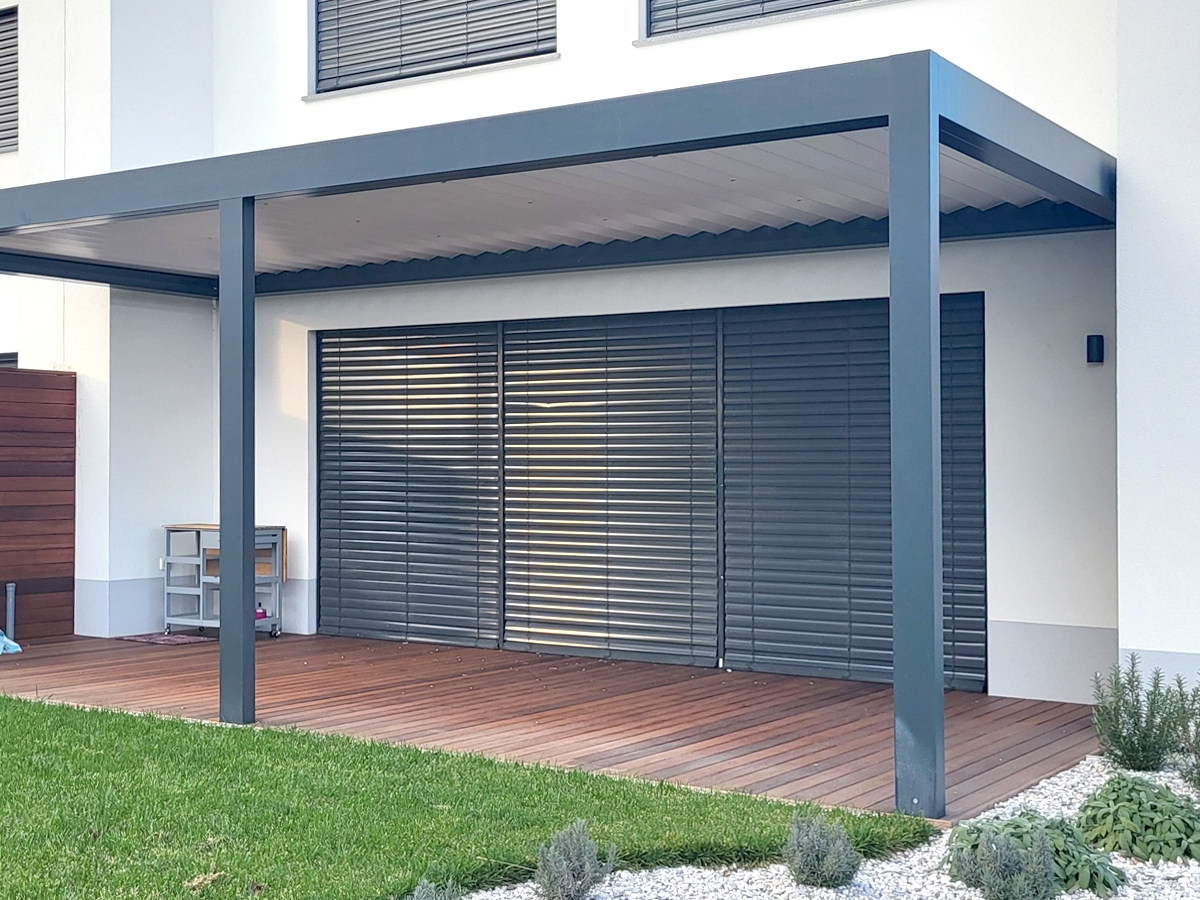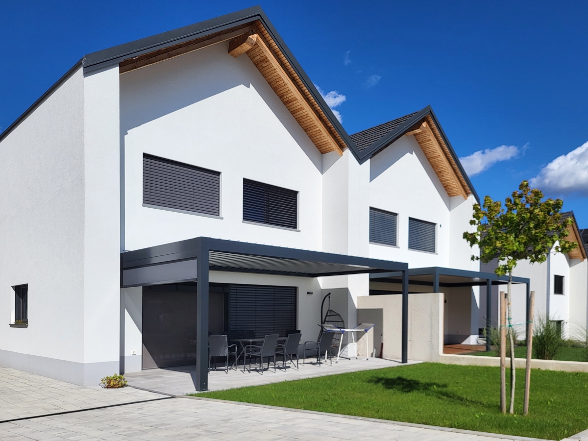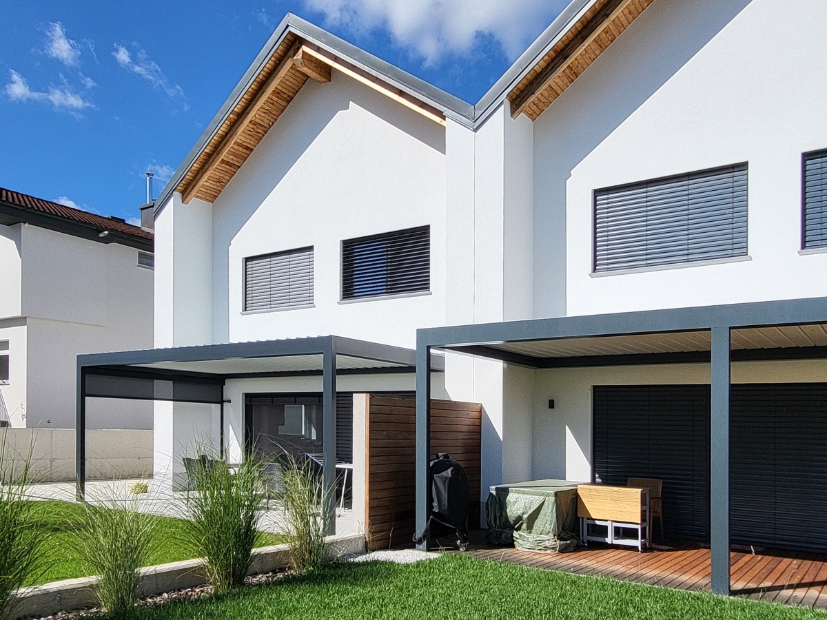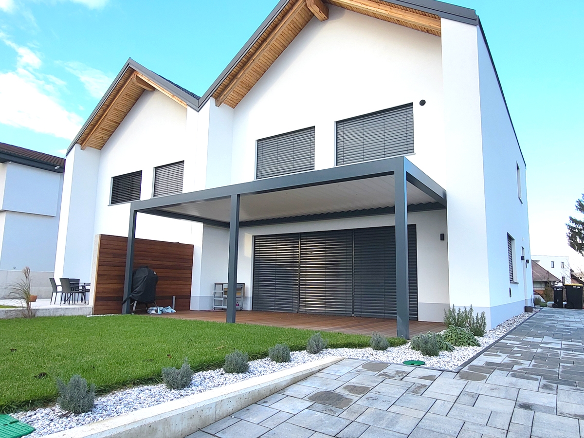 Bioklimatska pergola BASIC-XL na terasi družinske hiše v Ljubljani.